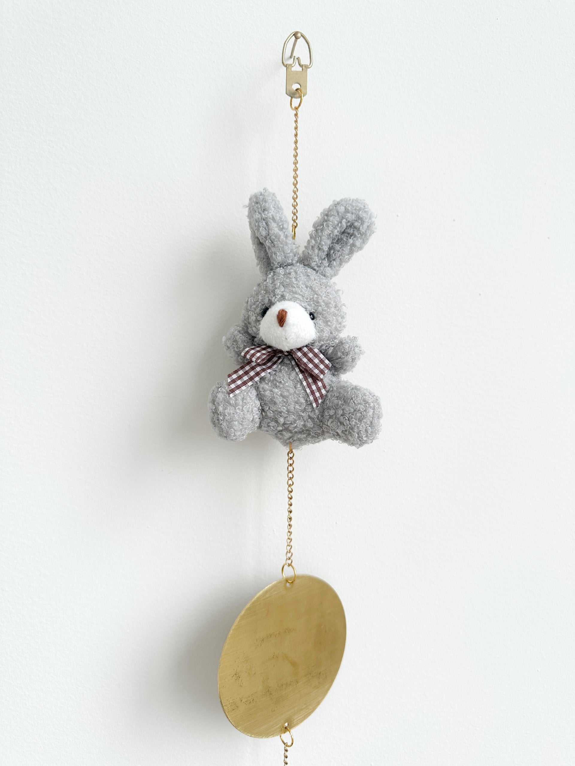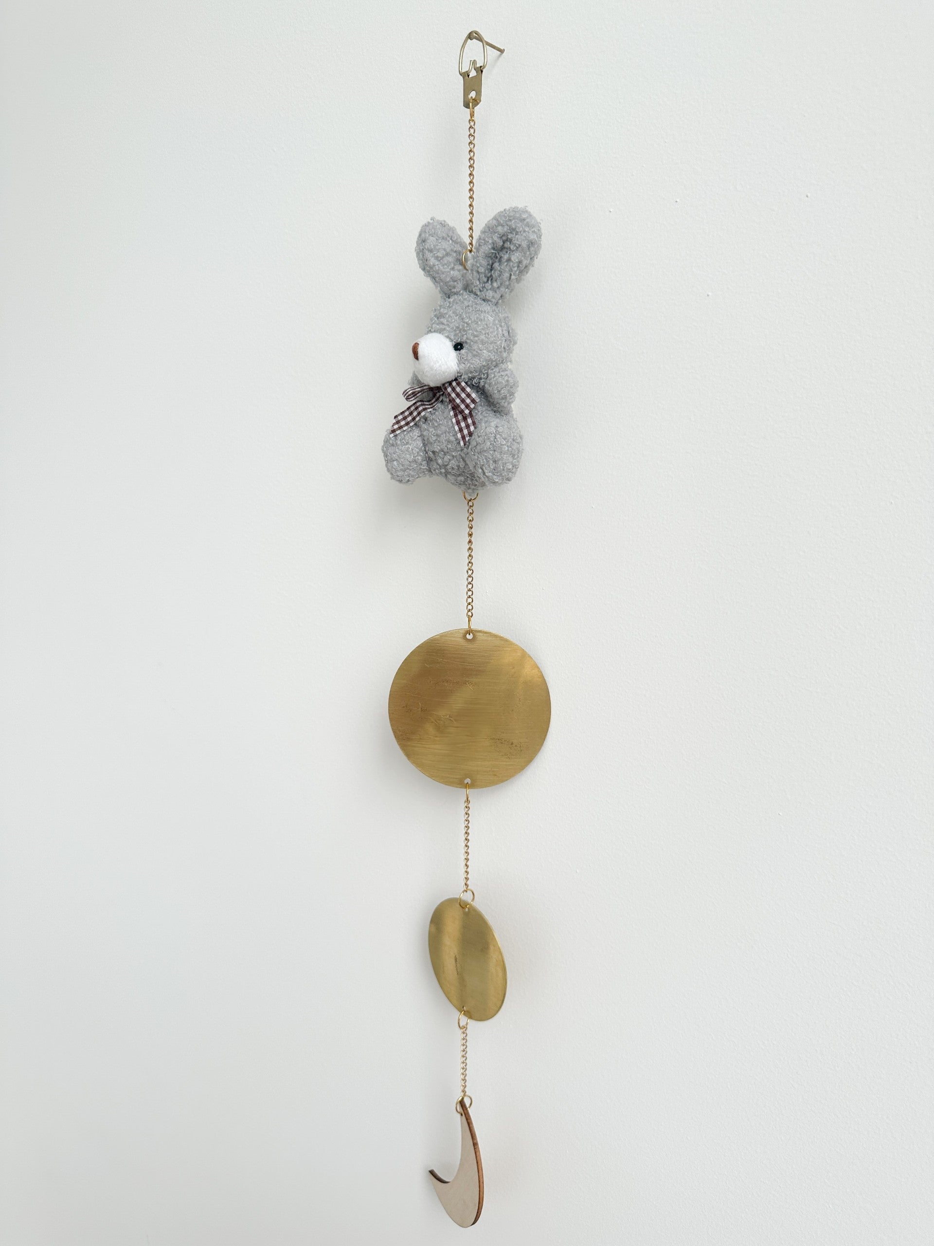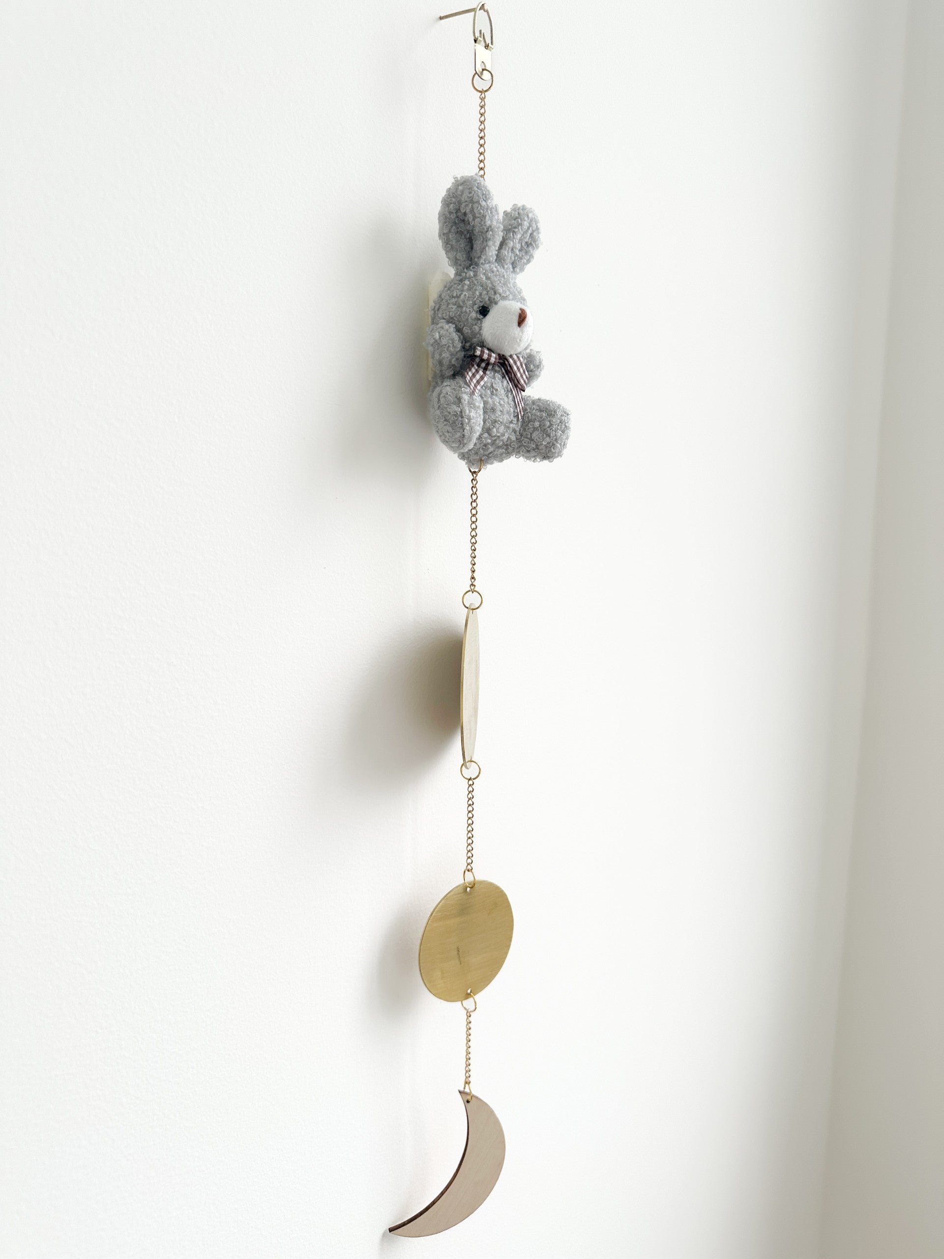 Hop into cuteness with this charming grey rabbit plushie featuring an adorable bow tie! Team it with brass moon accents and a wooden plywood moon to create a whimsical wall display that works in any space. Whether decorating a child's room or adding playful flair to your own sanctuary, this delightful set brings personality and warmth. Perfect for anyone craving a dash of magic and charm in their décor. Your room just got a whole lot more lovable!